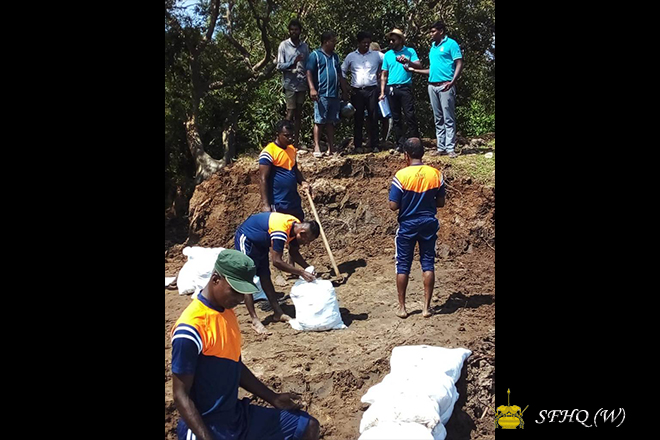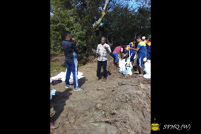 Acting on the timely instructions of Commander 562 Brigade, restoration efforts commenced under the direct supervision of the Commanding Officer of the 17 (V) Sri Lanka Light Infantry. On 04 December 2025, a 10-member team from the battalion, together with support from local residents, commenced the coordinated renovation of the embankment. The work focused on stabilizing the breached section and preventing further expansion of the damage caused by the heavy rainfall.