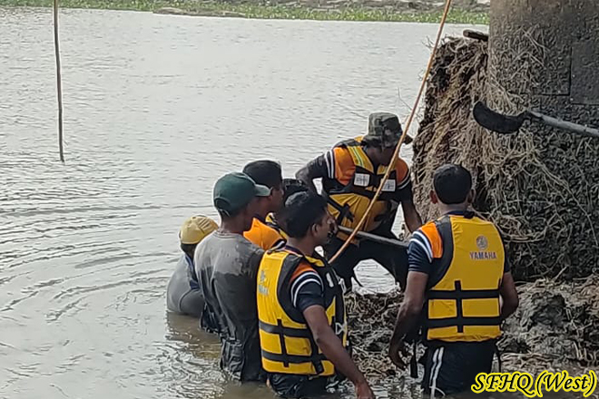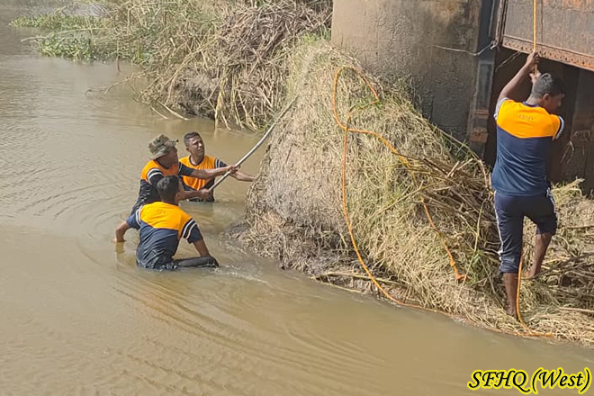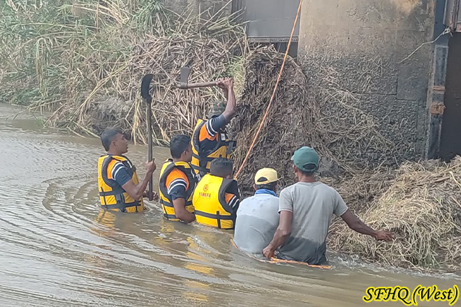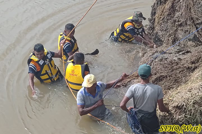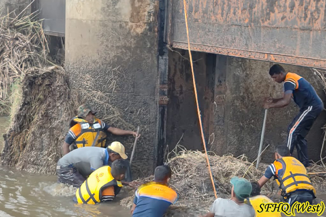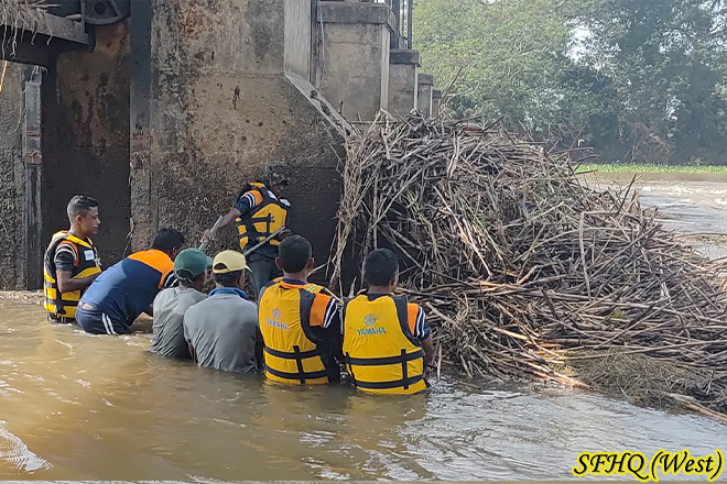 Kadupiti Oya, which supplies water to the Nelumpokuna Water Purification Plant, was disrupted by soil and debris, reducing the water supply. Responding swiftly, troops of the 22 Gajaba Regiment cleared the dam area in Madampe. After two days of continuous effort, the obstruction was removed, restoring normal water flow to the treatment plant.