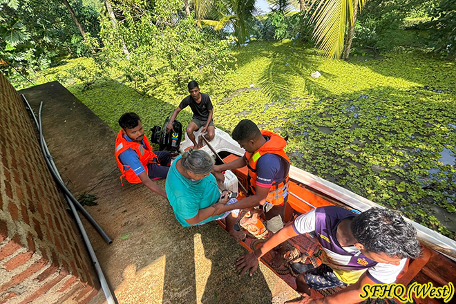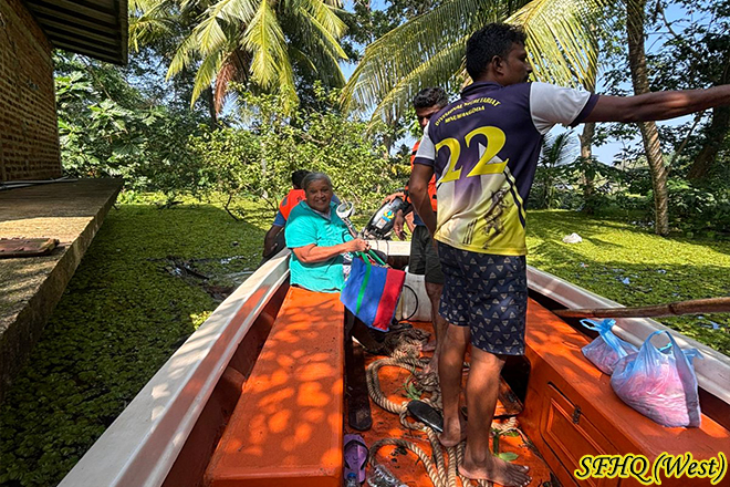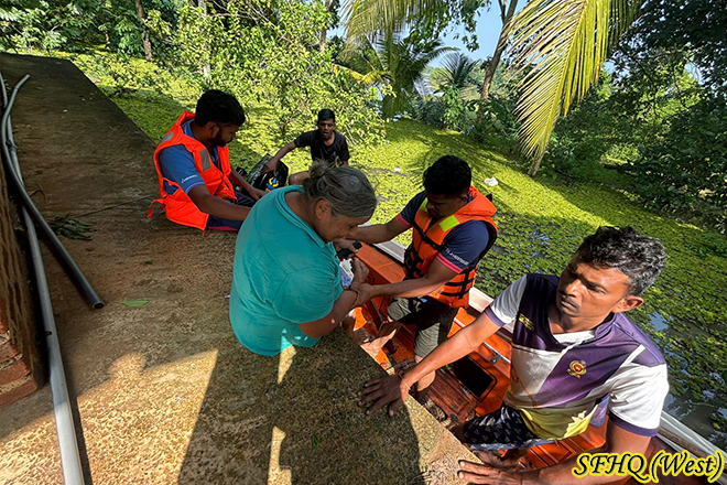 On November 30, 2025, troops from 6 Sri Lanka Artillery executed a prompt rescue operation in Minuwangoda area, where increasing floodwaters threatened a family with an old lady. A family was safely evacuated to secure locations. The troops' quick response ensured the safety and good health of entire family impacted by the flooding.
