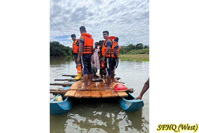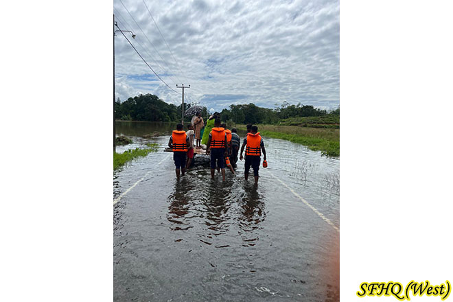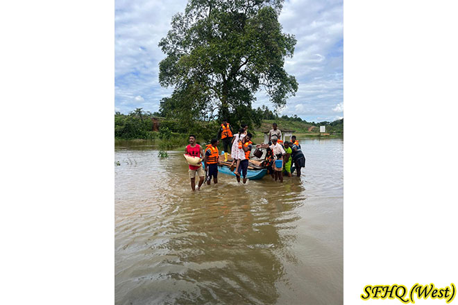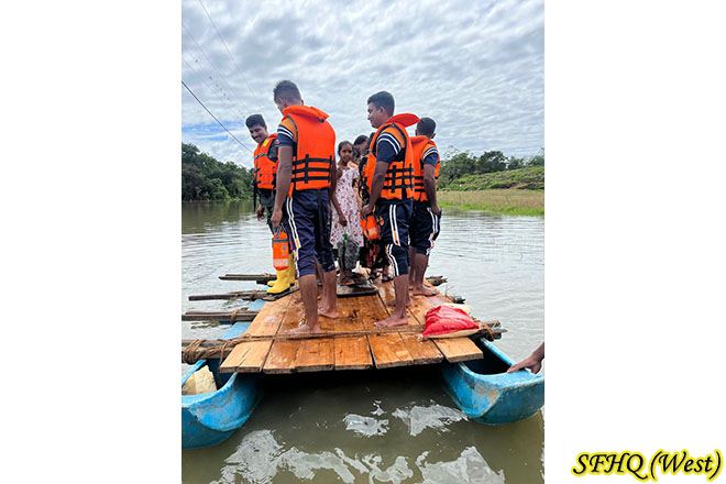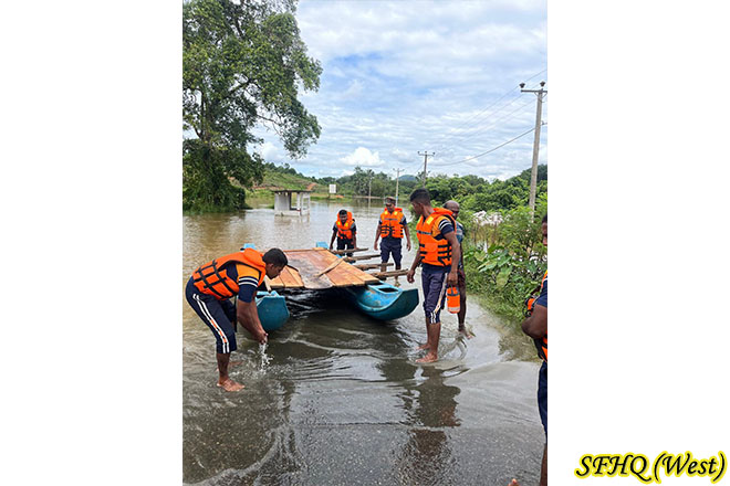 At Dambala, approximately 300 meters of roadway lie submerged under five feet of water, making the route impassable for light vehicles. Army personnel are providing boat transport services to stranded civilians.