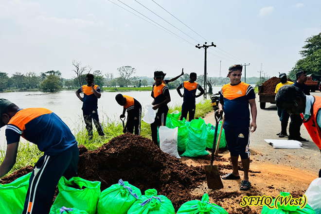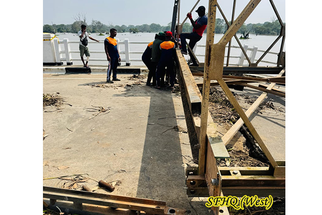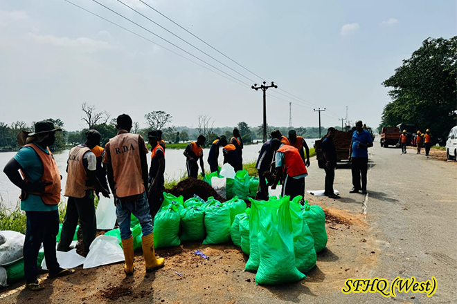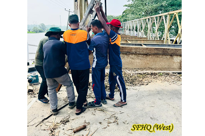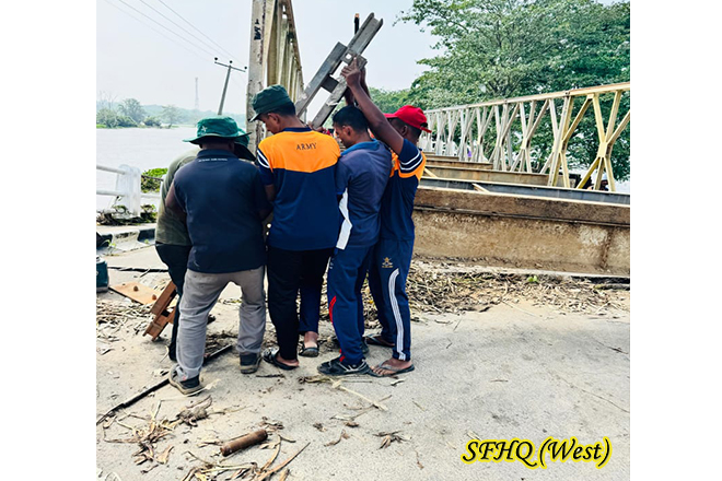 A bridge along the Puttlam-Anuradhapura road at Thabbowa was severely damaged following the recent floods caused by adverse weather conditions. Acting under the direction of the Commander, 57 Infantry Division and with the coordination 143 Infantry Brigade troops of the 1 Sri Lanka National Guard (1 SLNG) were promptly deployed to assist the Road Development Authority (RDA) in the renovation of the collapsed structure. Their timely support ensured the continuation of essential repair work, helping to restore safe transportation and connectivity for the affected communities.