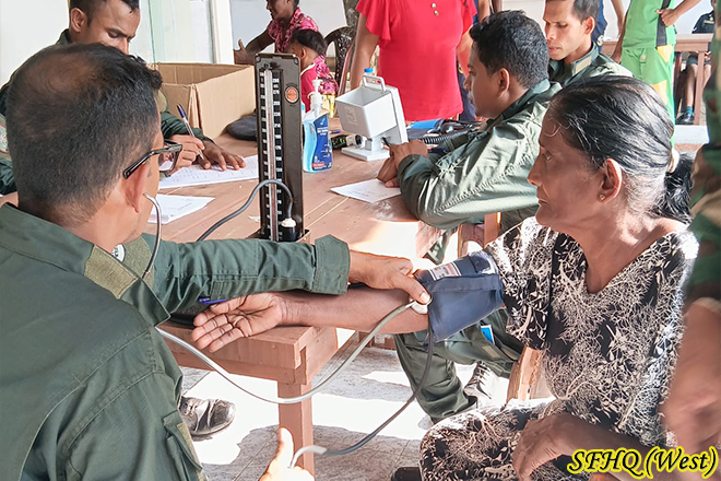 Under the direction of Commander 57 Infantry Division and with the close supervision of Commander 143 Inf Bde, two medical camps were conducted in Arachchikattuwa to support civilians affected by the adverse weather conditions. One camp was held at Bopathgama Sri Bopath Viharaya, Bandarahena, providing treatment to 222 individuals, including 101 males and 121 females. The other medical camp, conducted at Sri Nagarajaaramaya Temple, treated 155 people, comprising 88 males and 67 females in the area. In addition to these medical services, 400 tables were distributed for “Mee Una”, further safeguarding affected communities.