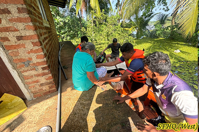On November 30, 2025, troops from 6 Sri Lanka Artillery executed a prompt rescue operation in Minuwangoda area, where increasing floodwaters threatened a family with an old lady. A family was safely evacuated to secure locations. The troops' quick response ensured the safety and good health of entire family impacted by the flooding.