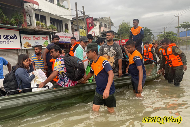 On 29 November 2025, troops of the 14 Vijayabahu Infantry Regiment supported the Ja-Ela Police in a crucial rescue operation across the Ja-Ela and Ekala areas. A total of 61 civilians, including two monks, were safely evacuated from flood-affected locations. The joint effort ensured the timely protection of residents as rising waters continued to threaten the region.